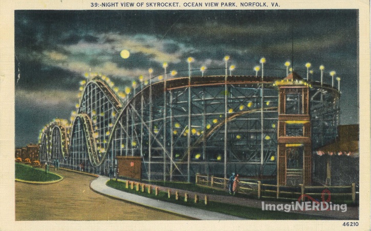 This particular postcard features a night view of the Skyrocket roller coaster. The Roller Coaster Database lists the Skyrocket Jr. coaster at the Ocean View Amusement Park. The construction supervisor is listed as Rudy Illions and the concessionaire was John Clark. Not much else is listed about the wooden coaster that began operation in 1949.