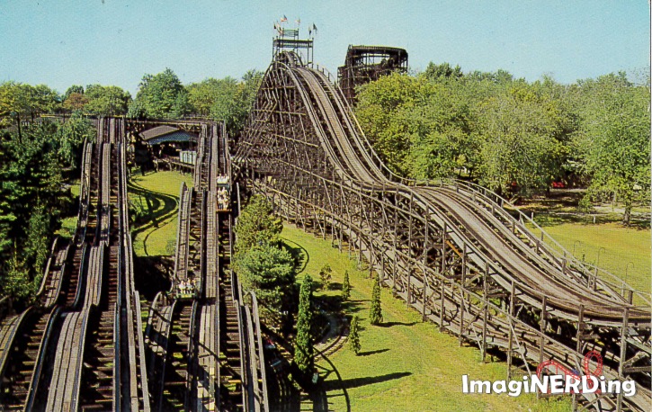 During its life, Euclid Beach Park boasted seven different coasters, including the Flying Turns (like the one at Knoebels), the Thriller, and the Derby Racer that operated from the first decades of the 20th Century until the park’s closing on September 28, 1969. I’ve seen the Derby Racer also referred to simply as The Racing Coaster on several fan-based and historical sites.