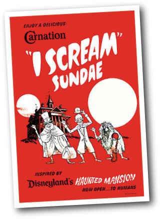 In 1969, one of the promotional tie-ins for the grand opening of the Haunted Mansionwas the “I Scream” Sundae provided by Carnation. The sundaes were sold at the Carnation Gardens Plaza and the Carnation Ice Cream Parlor on Main St. In the photo below, you can see the Carnation Plaza Gardens at Disneyland (thanks to Daveland for the picture).