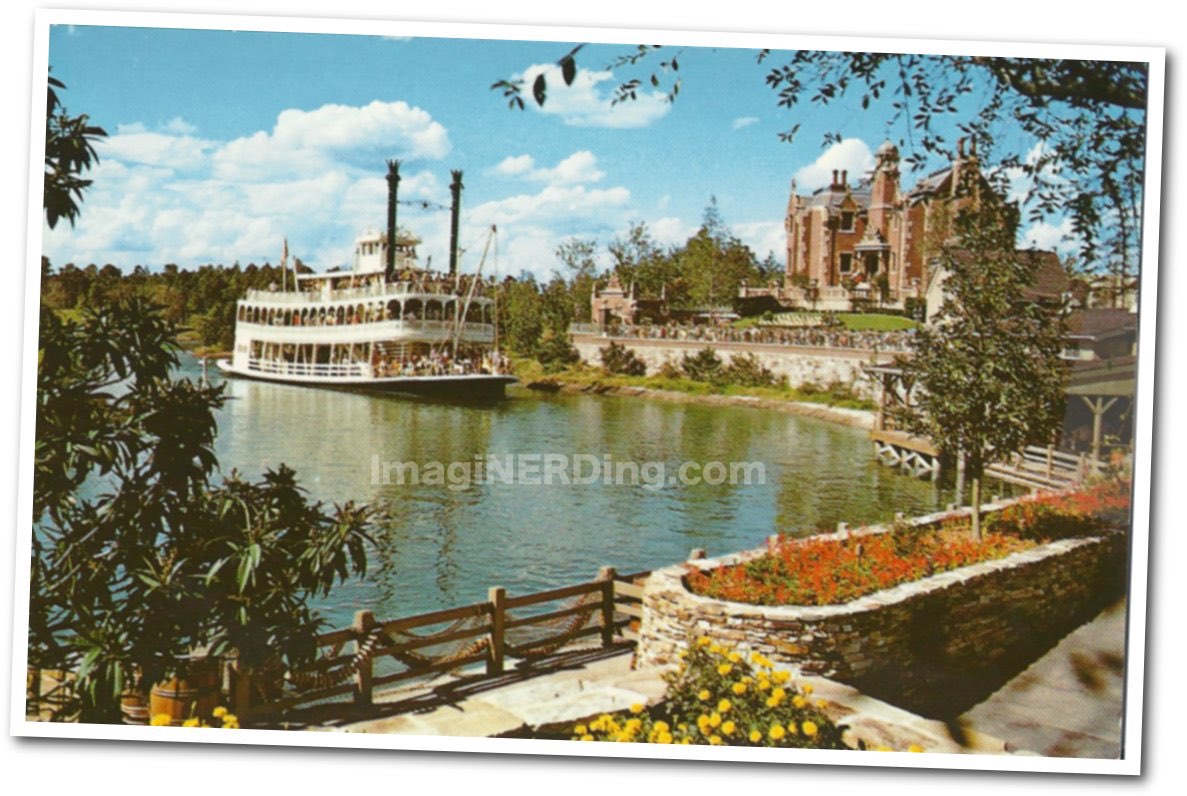 This is an amazing shot of the Admiral Joe Fowler on the Rivers of America with the Haunted Mansion in the background. Notice that the canopy has not been installed at the Haunted Mansion to protect the guests from the Florida sun. It affords a much nicer view of the mausoleum entrance and the front of the mansion. This dates the postcard from the first year, since the canopy was installed in 1972. The first canopy was green and would be replaced with the red one we see today.