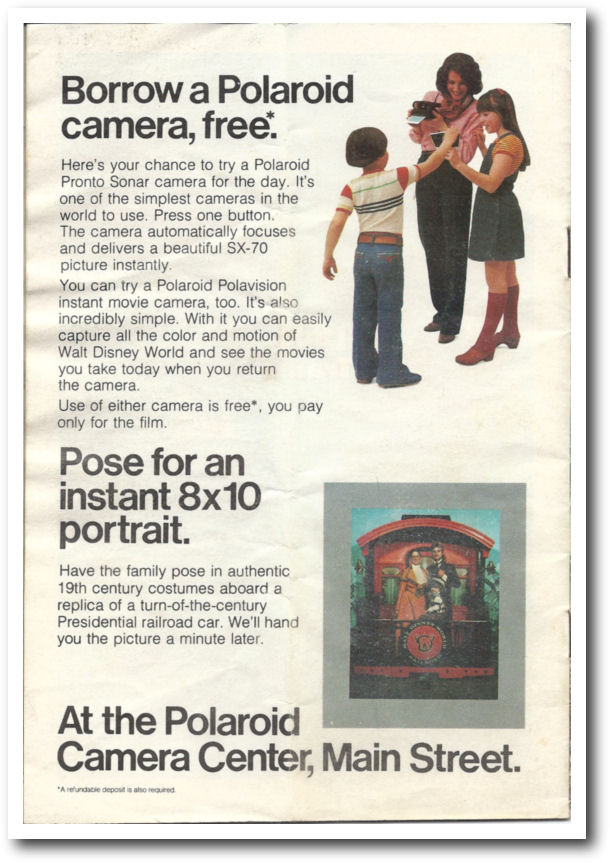 This guide also offered details on how to use a Polaroid Pronto Sonar camera during your visit to the Magic Kingdom. The camera is free*, you pay only for the film. Of course, the fine print does mention a refundable deposit is required.