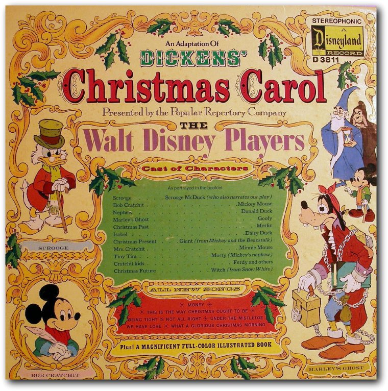 Titled Dickens’ Christmas Carol with the Walt Disney Players, the 1975 album boasted the largest assemblage of major Disney characters gathered for a recording. Mickey “played” Bob Cratchit, Uncle ScroogeMcDuck “portrayed” Ebenezer Scrooge, and Alan Young provided both of their voices as well as that of Merlin from The Sword in the Stone (as the Ghost of Christmas Past]. Young also wrote the entire script, although he shared the writing credit with Dinehart on the strength of an additional quip in which Willie the Giant (the Ghost of Christmas Present) says to Scrooge, “We have along way to travel and we must fly. Take hold of my robe—Duh, not back there, unless you want to fly tourist!”