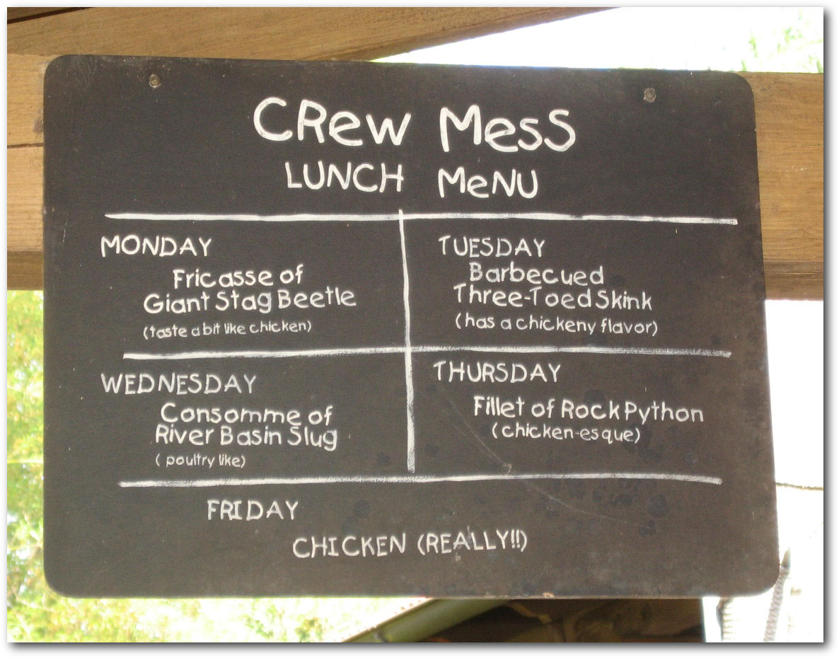 As you navigate the queue, pay attention to the signs, reference and crates which help tell the story of the Jungle Cruise and its crew. Right before load, you will find a sign detailing the Lunch Menu for the crew of the Jungle Cruise.