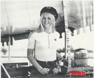Skipper Kathy Knutson is one of two hostesses who operate our fleet of hotel launches on the waters of Bay Lake and the Seven Seas Lagoon. Pictured here at the helm of “The Explorer”…Kathy takes guests from both resorts and the campgrounds to the Magic Kingdom and back.—Eyes and Ears, March 03, 1973