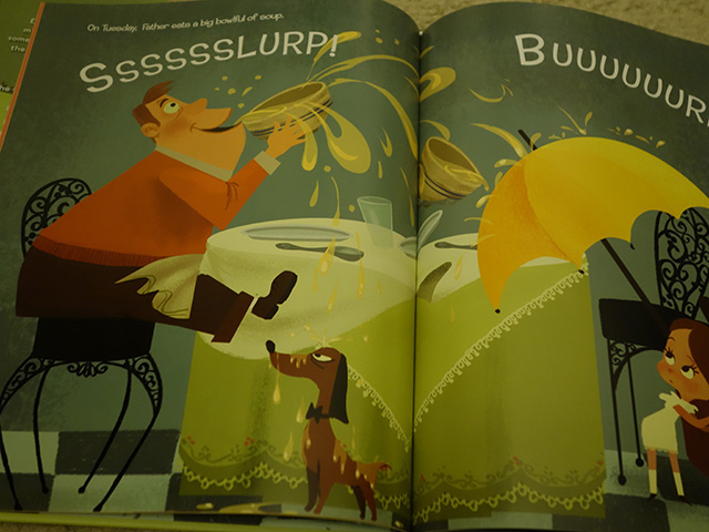 The text of No Slurping, No Burping, while not monumental (or expected to be), is appropriate for the audience and does teach several lessons while also reinforcing the days of the week. It reminded me a lot of what you would expect in an animated short, especially with the father being the buffoon and the children having to correct their father. I’ve seen a few reviewers take offense with the portrayal of the father in the book, but if you’re a dad reading this with your kids, you’ve got a wonderful opportunity to really ham it up and act it out.