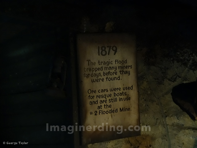 1879—The tragic flood trapped many miners for ays, before they were found. Ore cars were used for resque [sic] boats, and are still in use at the #2 Flooded Mine.