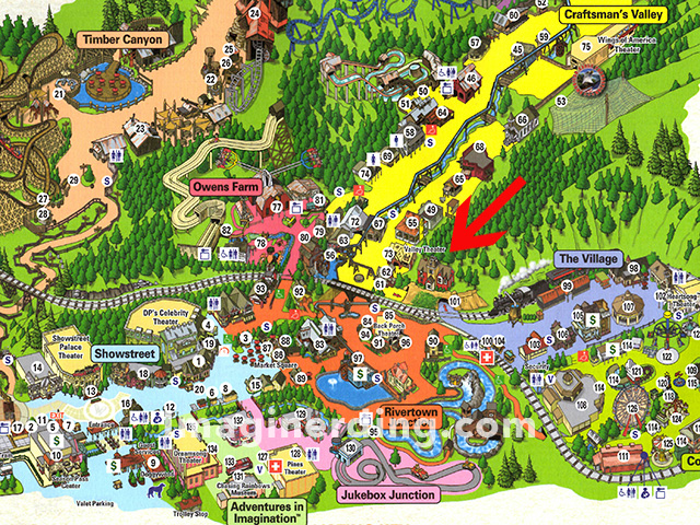 In the image below, the red arrow points out the mansion and you can see how most of Riverton Junction (in the brown/orange color was the former parking area and turnstiles for Silver Dollar City, Tn.