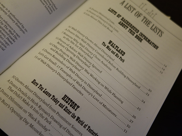 Jeff: There are 12 “chapters” within the book, with lists all relating to whatever the theme of that chapter is. Lists about Walt himself, the history of the park, geography, shops, pop culture, and more round out the book, and give it an overall entertaining, yet informative, feel.