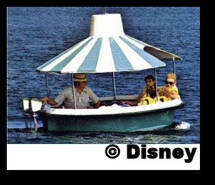 Rub a Dub Dub. Three (or four) people in a tub. These bizarre-looking striped boats had what looked like a lightening rod on top of them. (Florida is home to a lot of lightening, you know!) They were only around a short time after Walt Disney World opened. Apparently the boats were often the victim of dead batteries, which prevented them from Bob, Bob, Bobbing Along.