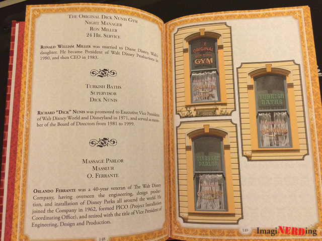 The layout makes perfect sense for Main Street Windows and features one to two windows per page on a double-page layout. On the left side, you’ll find the text from the window as well as a biography or explanation for the tribute. On the right side you have an actual photograph of the window from the park. In some cases what Heimbuch presents is the only documented evidence from the parks. I know I’ve struggled to make out what it says on some of the windows as I’ve made my way to the hub, so it’s fantastic to have the full text written out. In many cases, Hemibuch’s transcriptions are the only ones I’ve ever seen. The largest sections are for Disneyland and the Magic Kingdom, in which every window is photographed. For the foreign parks, every window is mentioned but not every one has a photograph.
