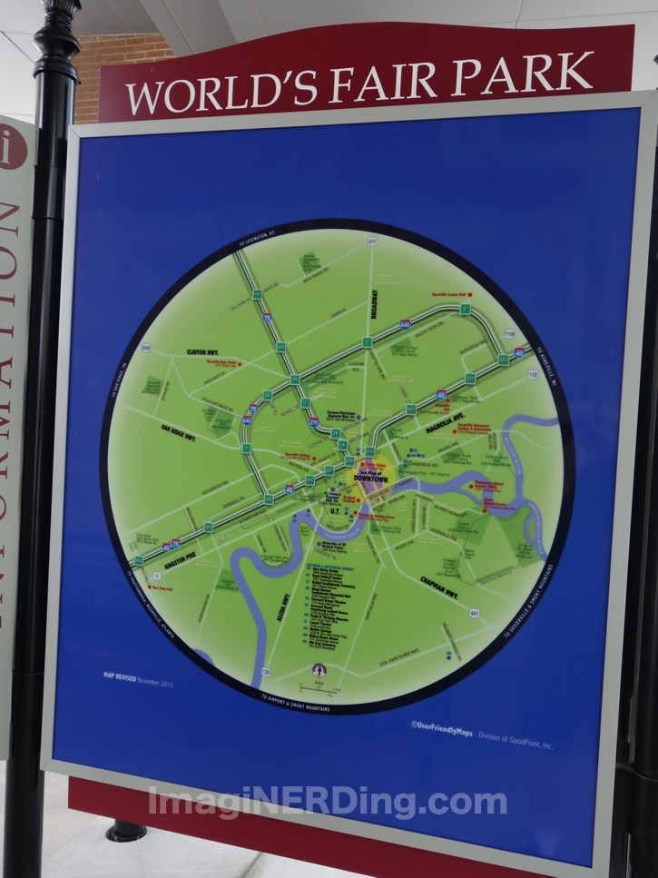 Currently, there are only two structures left over from the 1982 World’s Fair: the Sunsphere and the Tennessee Amphitheater. The items highlighted on the map are municipal buildings.