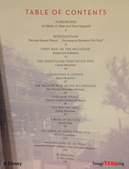 So, here’s the list of the mountains covered: Matterhorn, Space, Big Thunder, Typhoon Lagoon (Mount Mayday) and Blizzard Beach (Mount Gushmore), Splash, Grizzly Peak, Mount Prometheus and Expedition Everest. There’s even a few pages dedicated to Candy Mountain, which had been shown at Disney California Adventure.