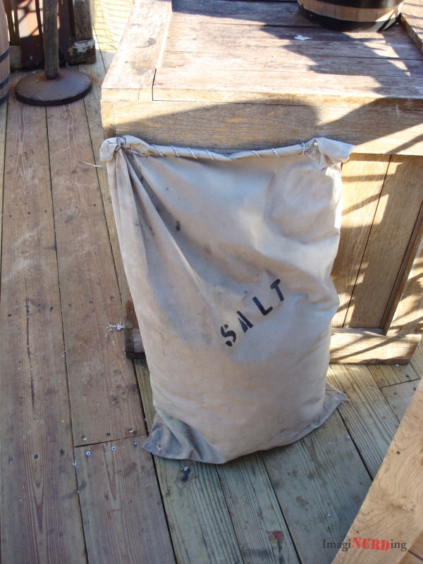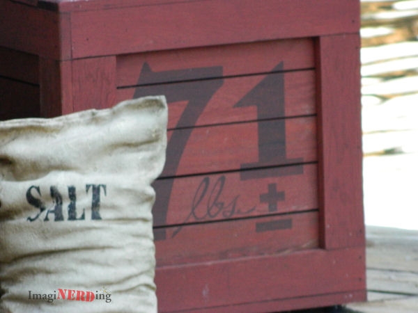As we walk by the Riverfront, you can see various crates and sacks. Right away, we see a sack of salt and a crate labeled 7 lbs 1 oz. (Catch the clever reference to 1971?)