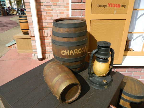 A newer display near the Sorcerers of the Magic kingdom that features a nondescript barrel and some charcoal! We can definitely use the charcoal for grilling.