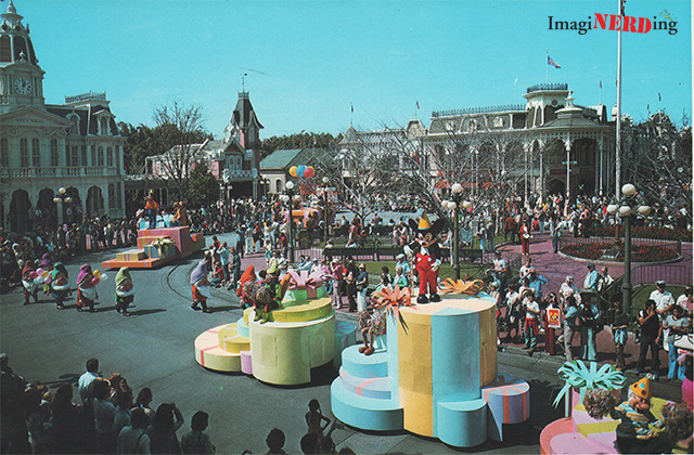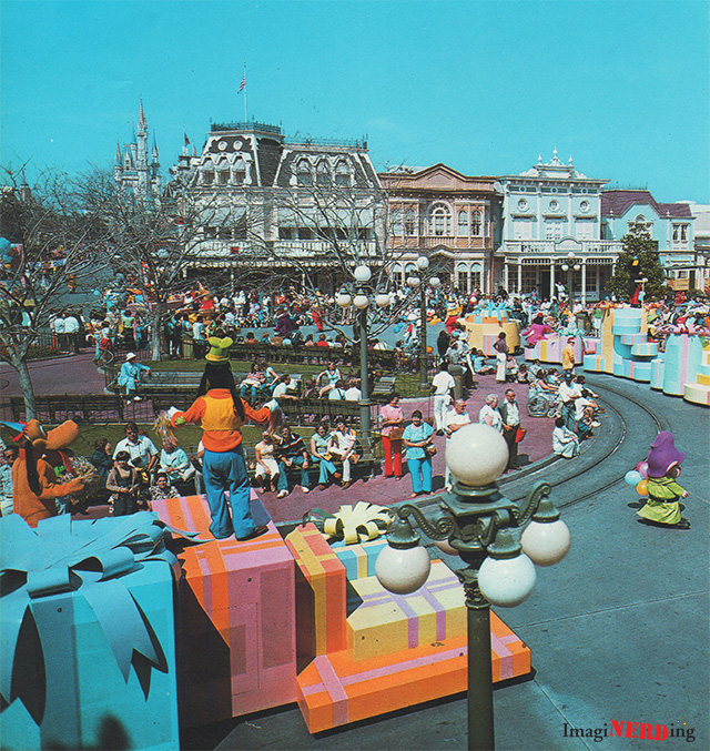 There are a few great shots of Town Square and the parade for Mickey’s 50th Birthday. It’s difficult to see in these scans, but there are screens or grates on the sides of the floats. I’m assuming the grates are for speakers.