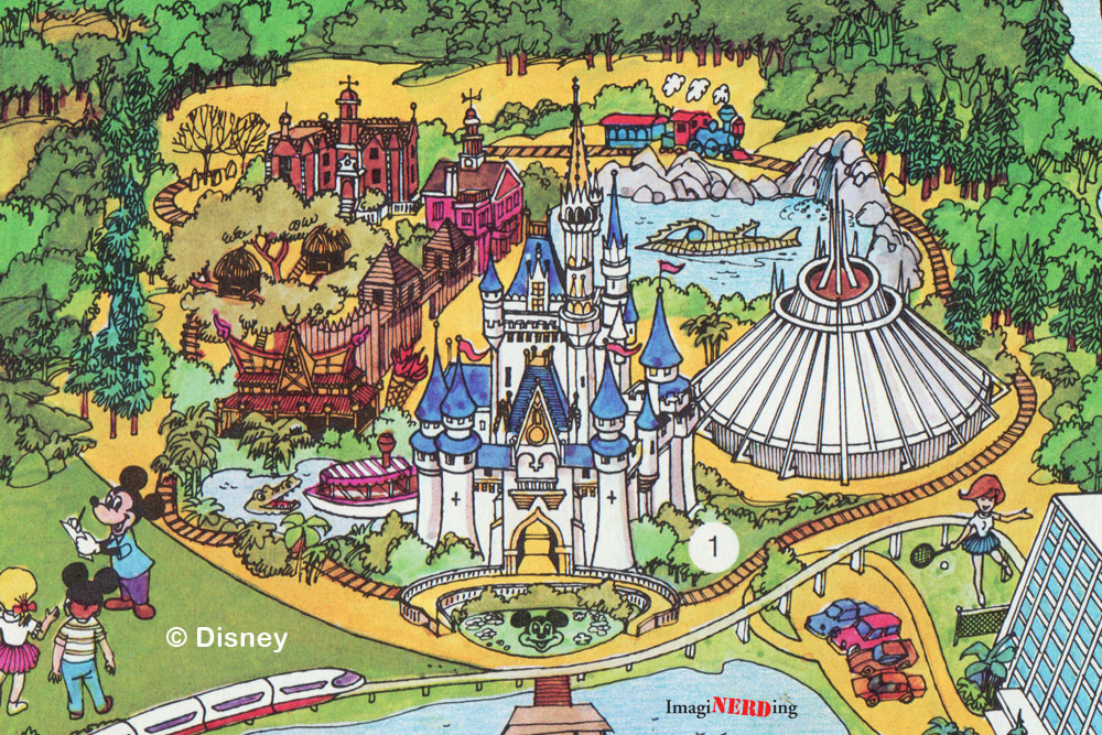 A closeup of the Magic Kingdom section of the map from the 1971 Story of Walt Disney World. This was also the map that appeared in the guest rooms of the Contemporary and Polynesian Resorts. It’s looking more like the Magic Kingdom, but there are still some differences. You can see the show building for the proposed Western River Expedition in Frontierland. Did you know that the yellow building in the bottom right corner of Main St was supposed to be a hotel?