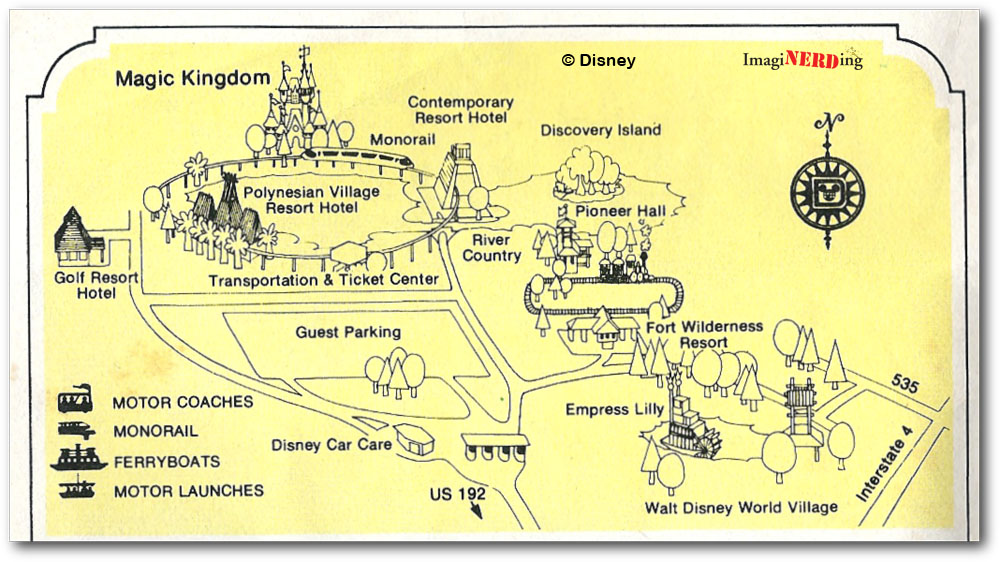 The 1978 Your Guide to Walt Disney World (below) offers two views that are as different as any other set of Magic Kingdom maps with each other. The first one is a very stylized view of the entire resort with a single icon to represent the individual areas. Notice how large the parking lot is and that it is centrally located?