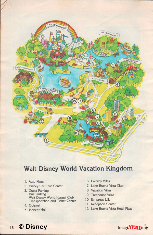 The map above is from a 1978 magazine-style PR piece. It follows the same caricatured style that we have seen in the later part of the 1970s and we can see the Village Marketplace, Village Resort and the Lake Buena Vista Hotels. I have to admit that I love the purple Haunted Mansion and the giraffe peaking out from the Jungle Cruise.