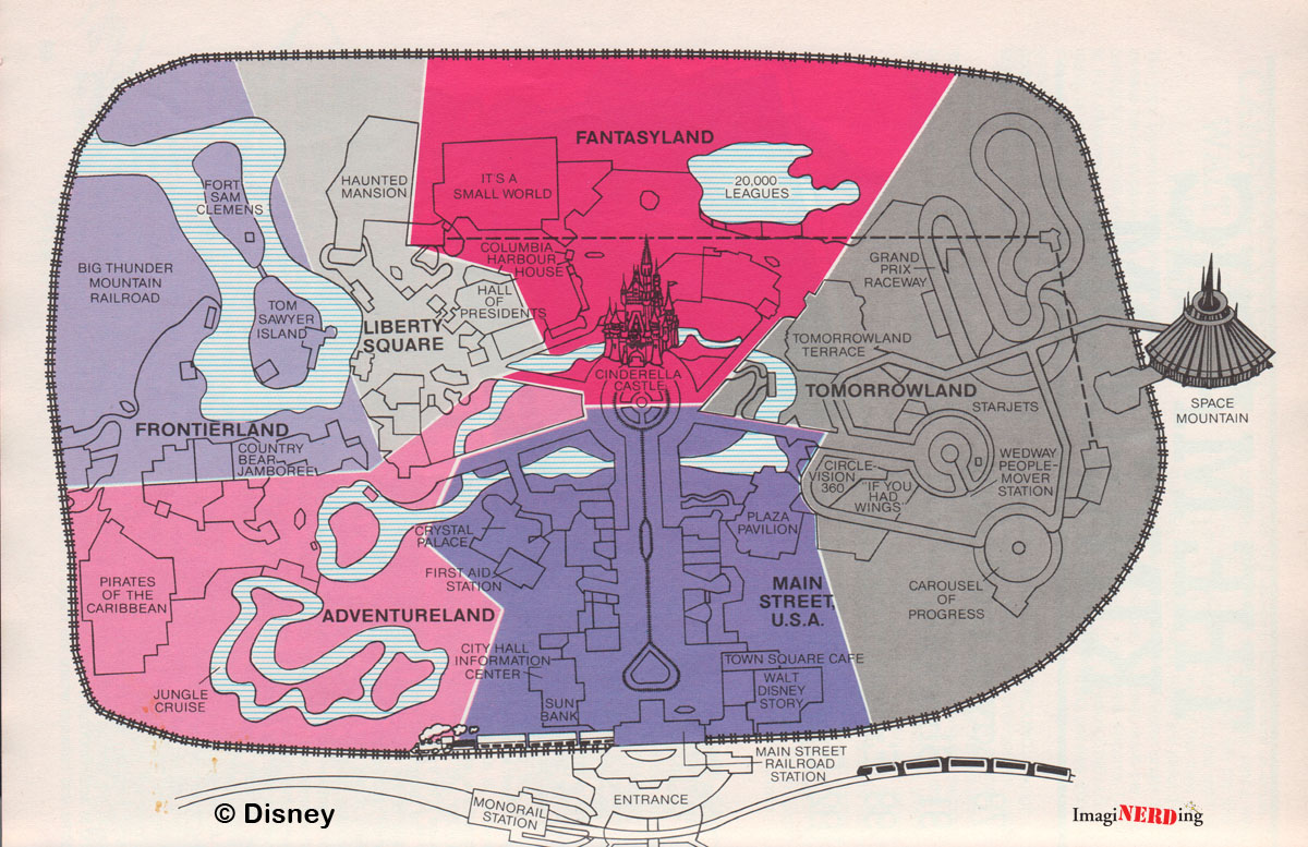 The above image is an overview of the Magic Kingdom. Is the dashed line simply to delineate the two sections dedicated to America? Any other thoughts? I also love that the “official” font is used for each land.