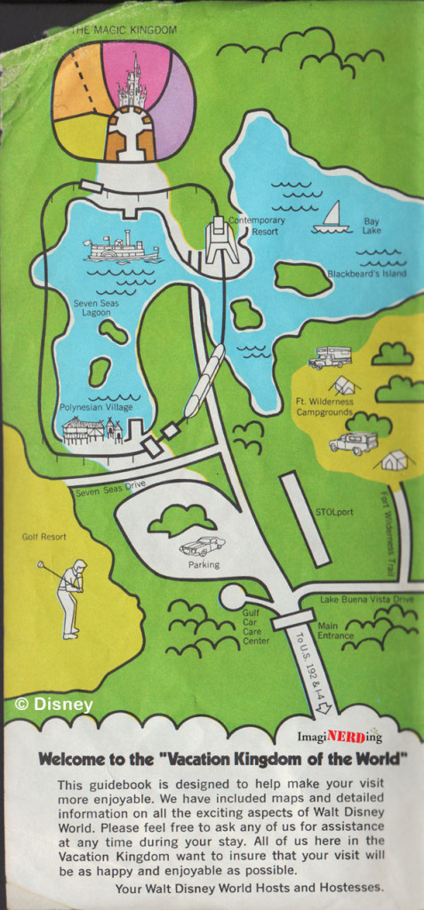 This Magic Kingdom map is from the Preview Edition that was sold in the Preview Center. It was one of the first published views of what could be expected in October, 1971. The full map only shows the Magic Kingdom, the two hotels and a plethora of recreational activities. It’s pretty accurate, sort of.