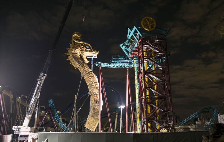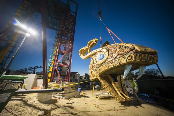 Dozens of artists united to design, engineer, fabricate and thematically paint the snake icon, creating a centerpiece for Cobra’s Curse that will bring riders just inches from its fangs. Standing at 80 feet tall, with 4-foot-long fangs and 3-foot-wide eyes, the icon was constructed of nine stackable pieces with an internal steel spine and an outer shell composed of carved foam and fiberglass.