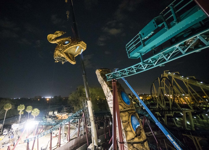 TAMPA, Fla. (Feb. 29, 2016) – There’s a giant snake in the Tampa skyline this week, as Busch Gardens® Tampa Bay just completed construction on the two highest points of its unique, reptile-themed coaster, Cobra’s Curse — a menacing 30,000 lb. snake king icon and a 70-foot vertical lift that will take riders within inches of its 4-ft. fangs.
