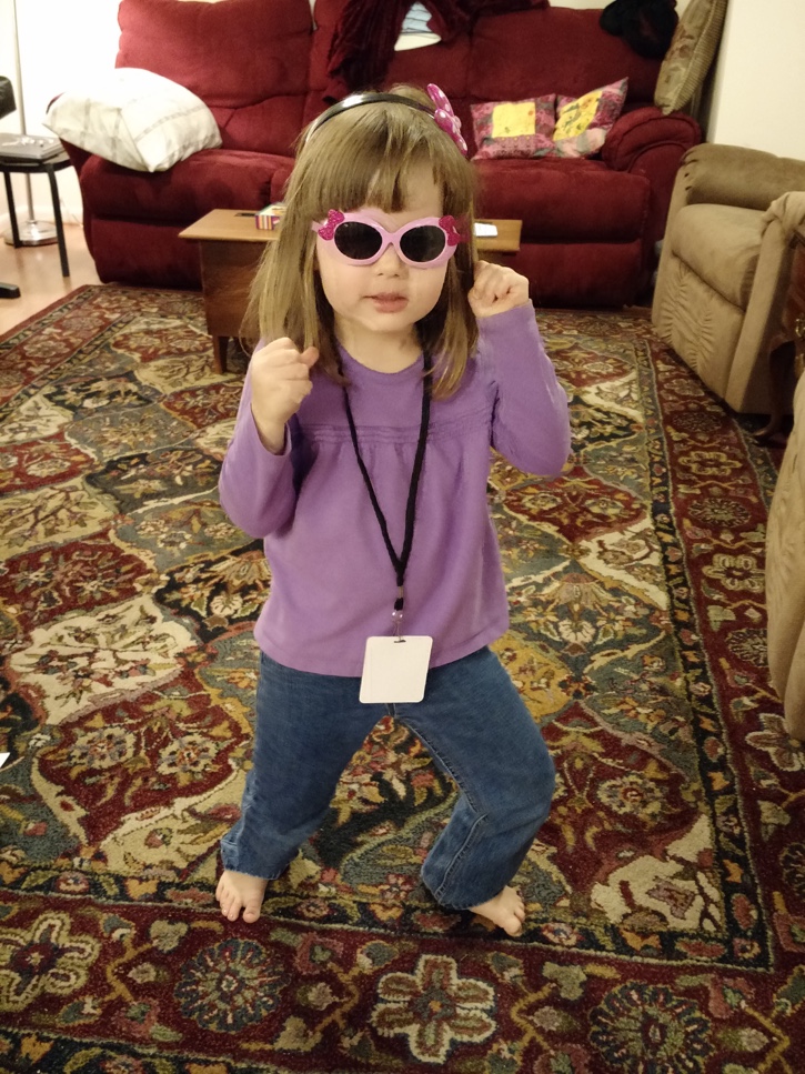 She said she knew the VIP badge was important because “Mommy wears one to work too!” She was disappointed that the lipstick wasn’t “real” and she needed extra help switching out bows on the head band, but otherwise, she had a great time imagining herself as the next great pop star!