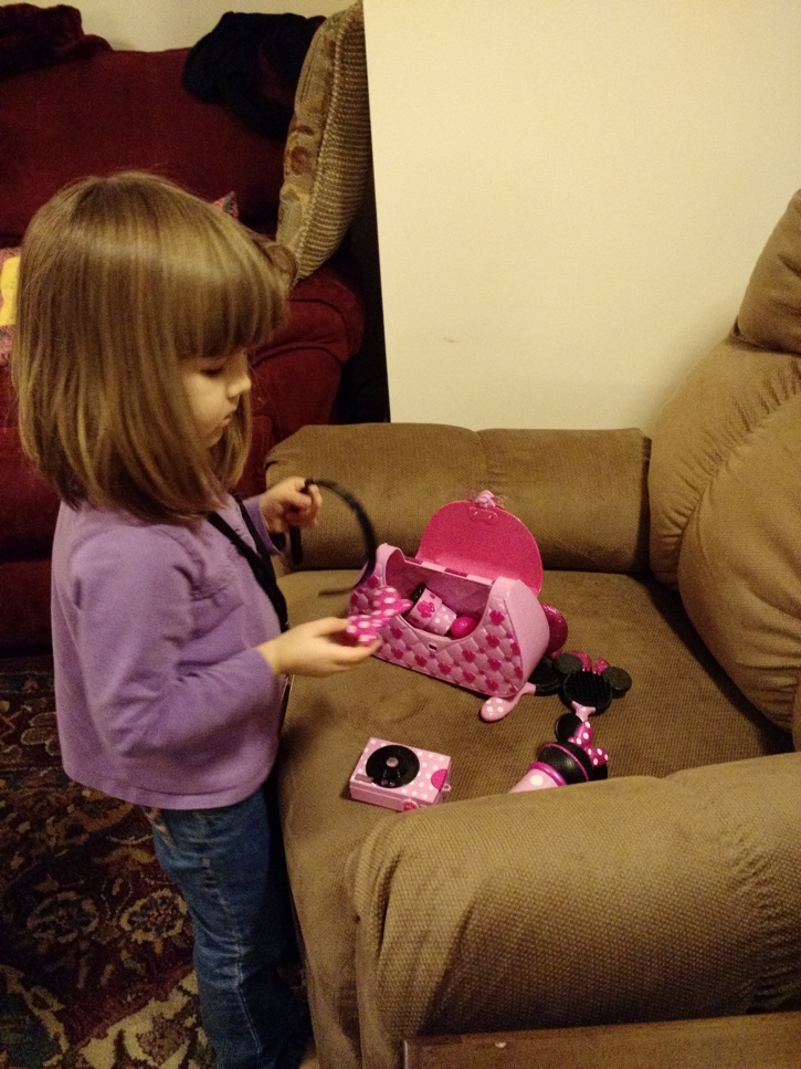 After watching Pop Star Minnie, our daughter put on her own show using the accessories from Minnie’s Pop Star Purse and Beauty Exclusive Set. She especially liked the sunglasses and the microphone which recorded and played back her own voice.