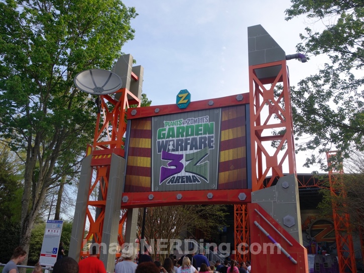 Plants vs Zombies Garden Warfare 3Z Arena is the latest attraction to open at Carowinds. It’s also the world’s first intra-active 3D attraction. And it’s based on the extremely popular franchise by PopCap Games and EA Studios. So, there is a lot of general appeal for the new attraction based on the popularity of Plants vs Zombies on so many different platforms. In the queue, the excitement of the under 14 set was quite palpable while the parents seemed a little anxious.