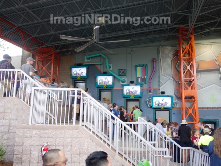 Currently, only one of the theaters is running, so both queues take you to the same side. The entire queue is outside, but there are several trees that will provide shade during the summer months of the Carolinas. Make sure to check out the posters and images on the wall that help tell the story. There are only 68 seats in the theater (that number will double when they open the second one), so it is about a 10-minute wait between games. Anyone familiar with Soarin’ at Walt Disney World understands the hurry up and wait effect. The kids are going to get pretty bored standing in one place for five minutes at a time. It’s a good idea to break out the Eye Spy game or ask them which characters they like better.