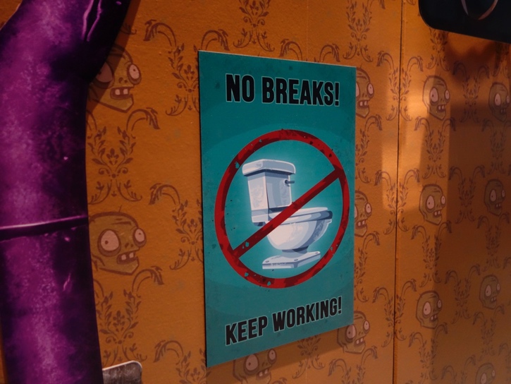 There are four rows of seats in the auditorium. The first half of the seats (about 7-10, depending on the row) are purple and the second half are green. The purple seats are Team Zombie and the green seats are Team Plant. Theme park etiquette proscribes that you walk all the way to the end of the row before sitting. If you want to be on the plants team, then be near the door. If you want to be a zombie, then be one of the last ones through the door.