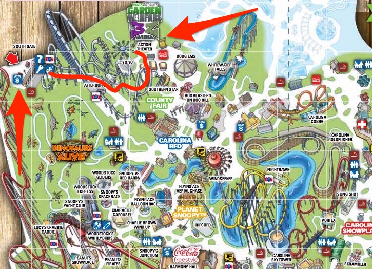 Want to hit Plants vs Zombies on the busier days? The Arena is a lot closer to the South Gate entrance (near Afterburn) and it it much less of a walk from the South Gate. usually the South Gate is only open during the busiest days.