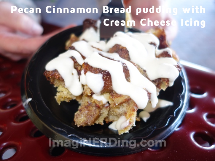 The Pecan Cinnamon Bread pudding was delicious! It reminded us a lot of Dollywood’s Homemade Cinnamon Bread. This was a dessert that we would seek out if it was Carowinds’s signature food (hint, hint). It was warm but not too sweet. It crumbled without falling completely apart.