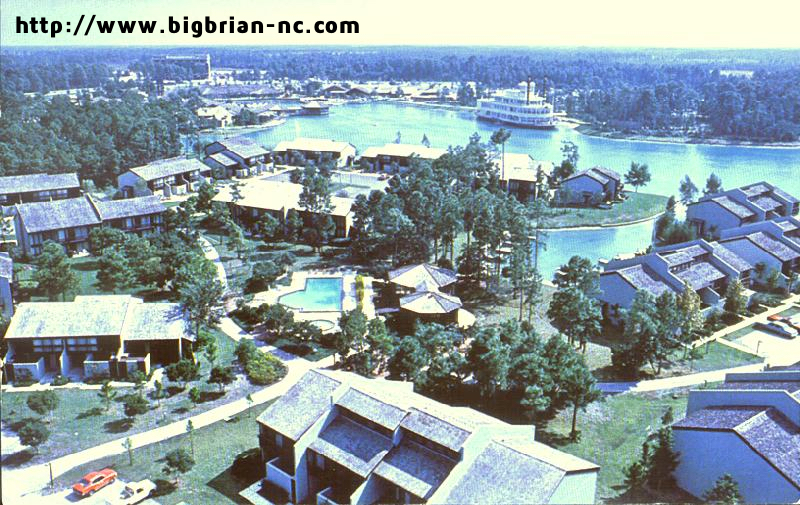 In this great postcard from BigBrianNC’s Walt Disney World a History in Postcards, you can see the two-story Vacation Villas and their relation to the Empress Lilly (now Fulton’s Crab House) and the Disney Village Marketplace. It’s difficult to make out, but the building jetting out over the water is the former Captain Jack’s Oyster Bar. Chef Mickey’s (now the Rainforest Cafe) is near that location.