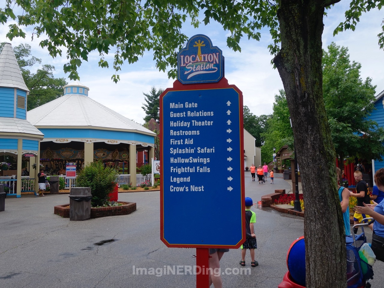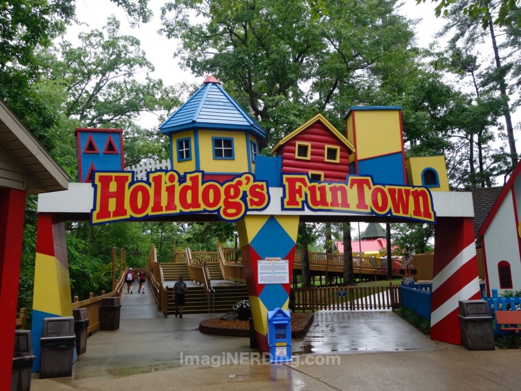 My visit was on a very rainy Saturday (who can predict the weather three months out) but Holiday World only closes during very bad weather or prolonged thunder storms. I knew it would be a different day, but I wasn’t sure what to expect, anyway! So, my photos do have some cloudy skies and wet pavement.