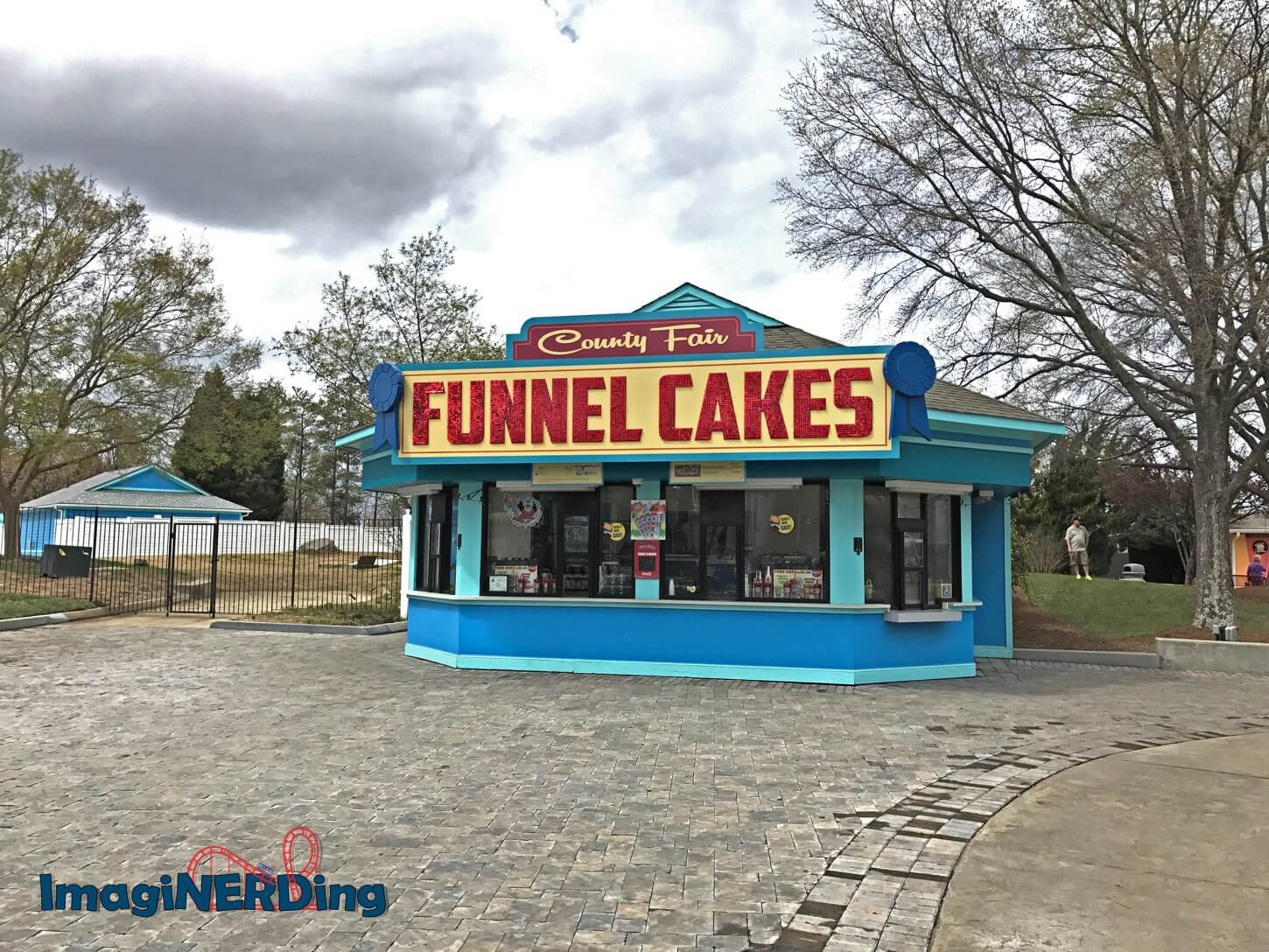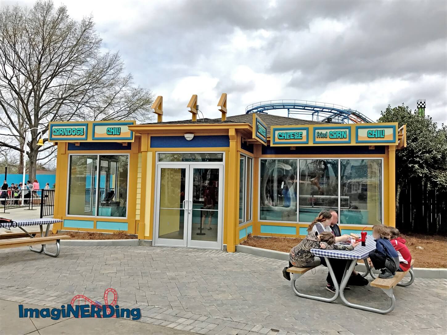 The former Fry Shack is now Fair Fries. during opening weekend, there still wasn’t signage on the quick-service eatery. According to the Carowinds web site: Fair Fries will feature…fries, but also traditional County Fair staples like corn dogs, fried corn, hot dogs and more! It looks like it will be a welcome reconfiguration with some fun picnic seating.