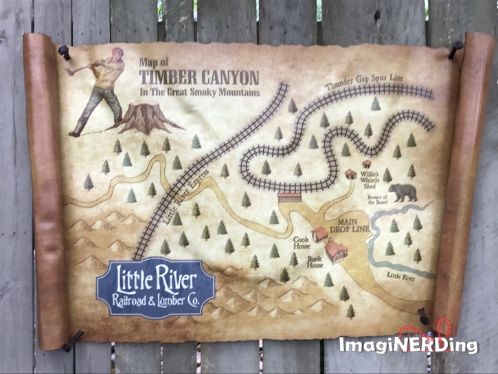The Map of Timber Canyon in the Great Smoky Mountains helps tell the story of the lumberjacks that helped create the area. The map, entitled Little River Railroad & Lumber Co., shows the trail that leads from the entrance of Dollywood (on the left side of the map) to the Cook House (Lumber Jack’s Pizza)and Bunk House. You go under the Little River Express (the train), past the Thunder Gap Spur Line (Thunderhead coaster), over to Willie’s Whistle Shed (the new Whistle Punk Chaser family coaster) and past the Main Drop Line (Dropline drop tower).