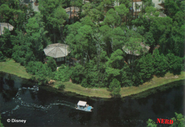 Treehouse Villas at Lake Buena Vista seen from above with a boat passing by on the river.