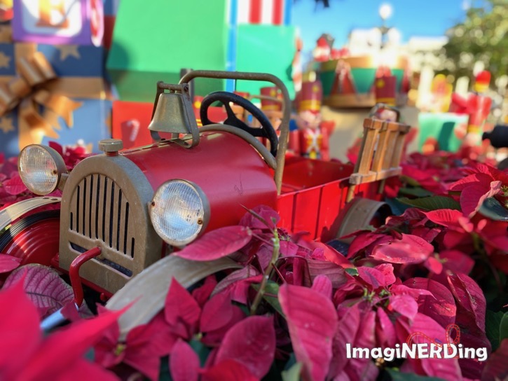 close-up of the lilly blue toy engine under the main street christmas tree at the magic kingdom