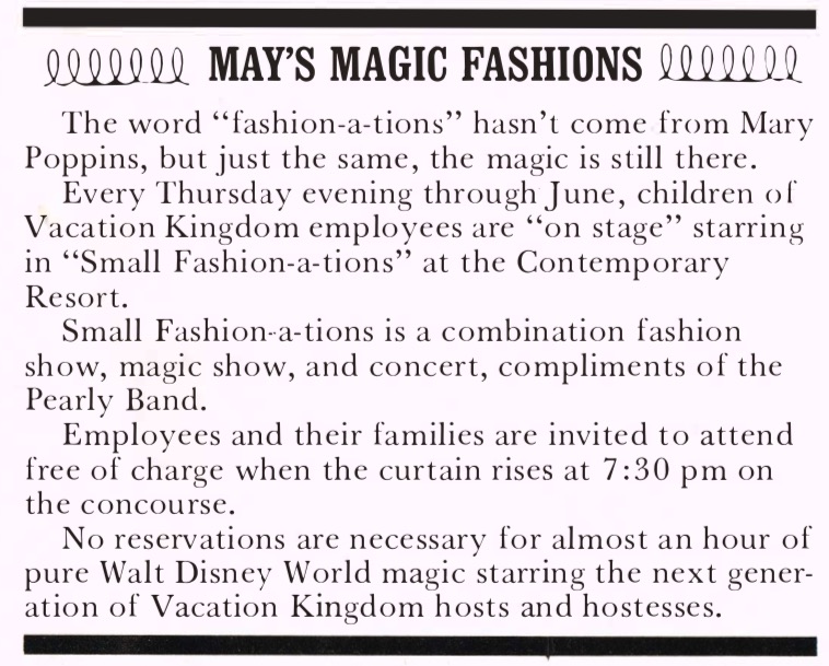 The May 13, 1972, Eyes & Ears cast newsletter had a blurb about a fashion show for the employees and families, featuring employee’s children. This is another one of those odd moments from Walt Disney World history.