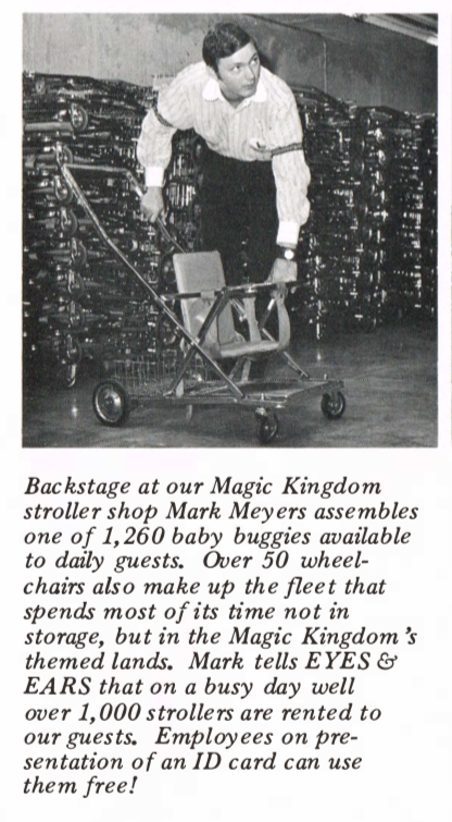 Apparently, strollers have always been a need at the Magic Kingdom, even during the first few years. In the July 29, 1972 Eyes & Ears Cast Member Newsletter, we meet Mark Meyers of the Magic Kingdom stroller shop.