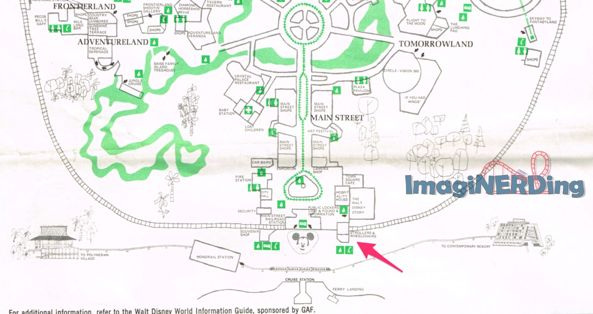 The same 1973 WDW News has a map of the Magic Kingdom which shows the location of the stroller shop. It was located just inside the turnstiles on the righthand side, just before heading into the park under the railroad.