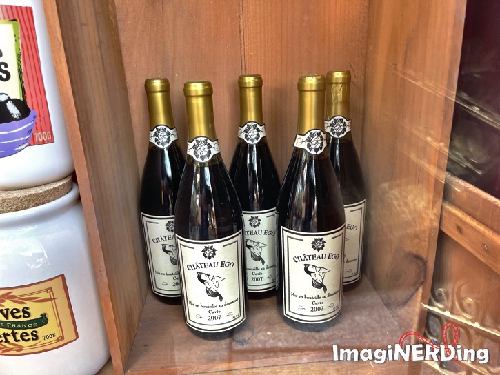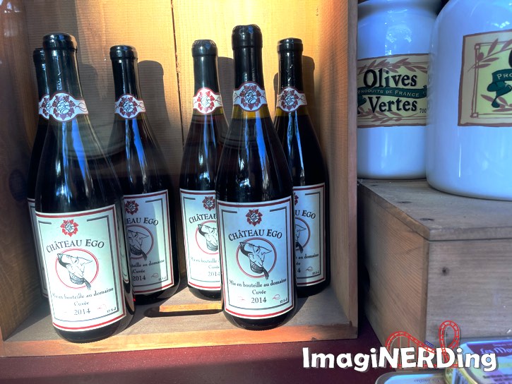 To the left of the fountain is a storefront window for items related to Ego from the animated film. In the display window are items like olives, sardines, pork pate, mustard, and anchovies. There are also three displays of wine from Chateau Ego.