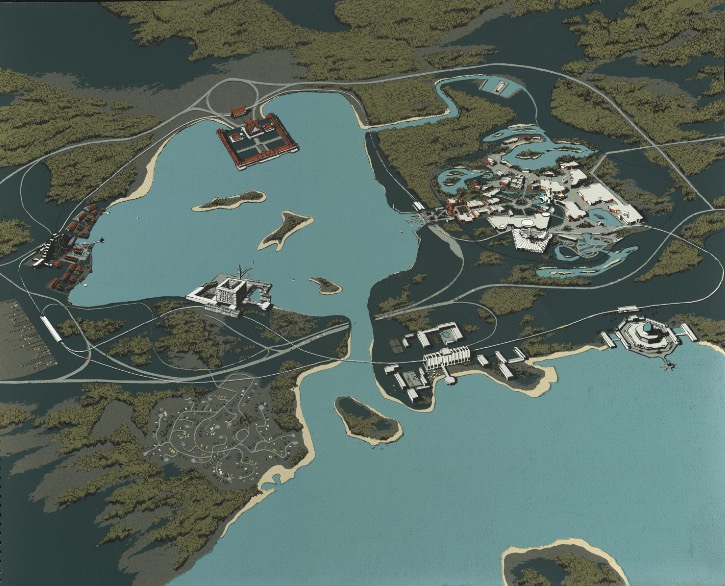 A significant contrast to California’s Disneyland will be the inter-relationship between the theme park” and the nearby “theme resorts,” so that both become part of the same “world.” A transportation network – monorail, water craft and land vehicles – will link the hotel-resorts to the entertainment entertainment.