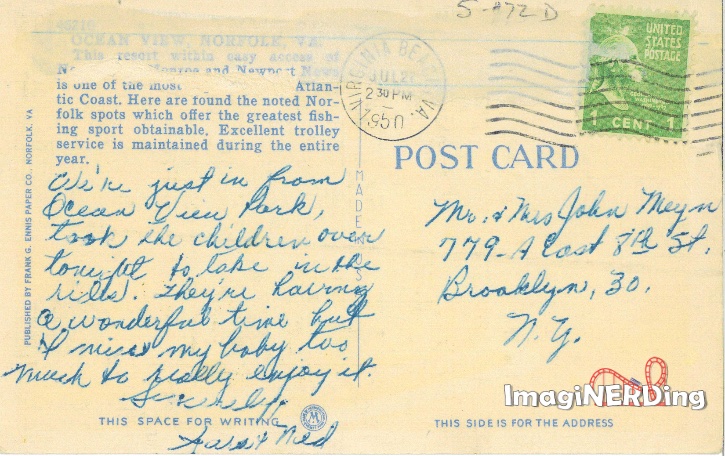 [Handwritten] We’re just in from Ocean View Park, took the children over tonight to take in the rides. They’re having a wonderful time but [I?]miss my baby too. Much to [really?] enjoy it.