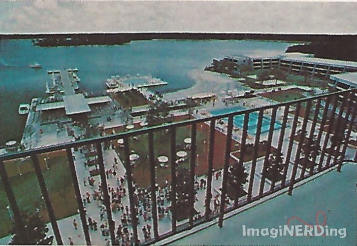 The official opening of the A-frame shaped Contemporary Resort Hotel, featured master of ceremonies Bob Hope. After fanfare of the event subsided, the gathering later dispersed for a luncheon buffet on the lagoon side of the hotel, hosted inside a striped tent along the shores of Bay Lake. “American Food Festival” was the theme, with dishes from New England, New Orleans, and the West, along with desserts from Florida.