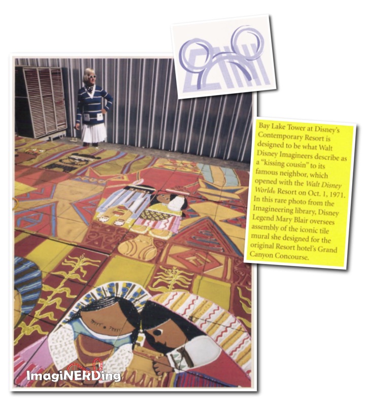 Caption: Bay Lake Tower at Disney’s Contemporary Resort is designed to be what Walt Disney lmagineers describe as a “kissing cousin” to its famous neighbor, which opened with the Walt Disney World® Resort on Oct. 1, 1971. In this rare photo from the Imagineering library, Disney Legend Mary Blair oversees assembly of the iconic tile mural she designed for the original Resort hotel’s Grand Canyon Concourse.