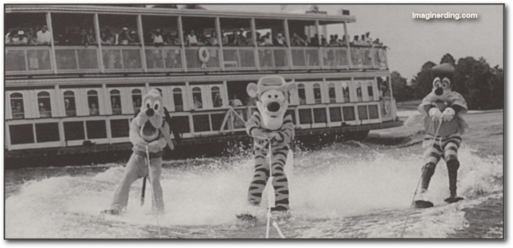 This team splashes its way around the Seven Seas Lagoon for 10 weeks each summer. In the mornings, guests traveling to the Magic Kingdom Park on ferryboats are surprised to see either Goofy, his son Max, Pluto or Tigger skiing by their ferryboat.