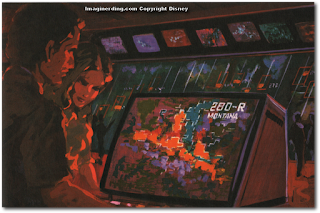 Concept art for Earth Station. Notice the screens and the attraction vehicle?