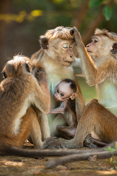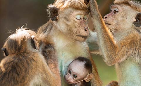 Characters: Maya and Kip. Description: Maya is groomed by other monkeys